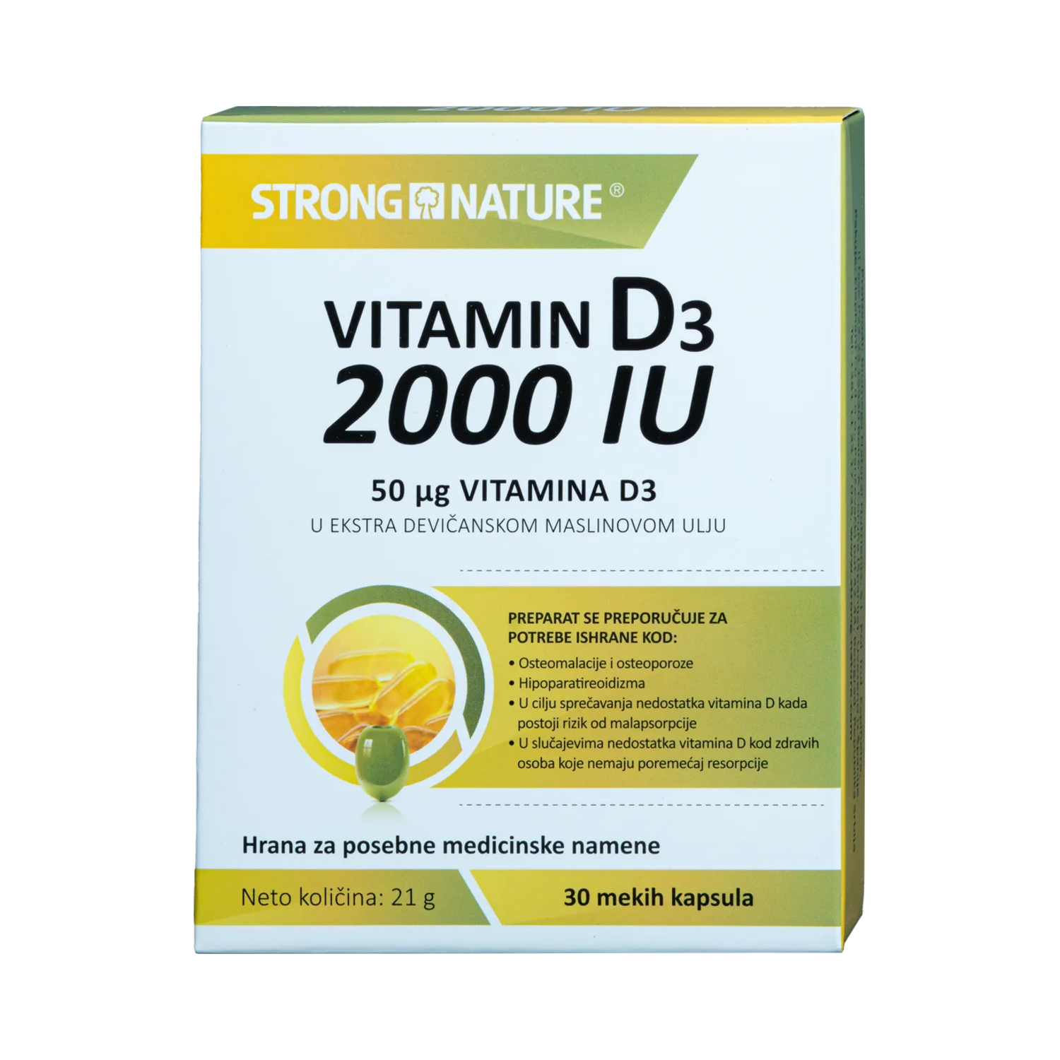 STRONG NATURE VITAMIN D3 2000IU za povećanje otpornosti organizma (zaštita od virusnih i drugih infekcija). Kod nedostatka vitamina D i nedovoljnog izlaganja sunčevim zracima. Za zdrave zube i desni, za normalnu funkciju koštano-mišićnog sistema.